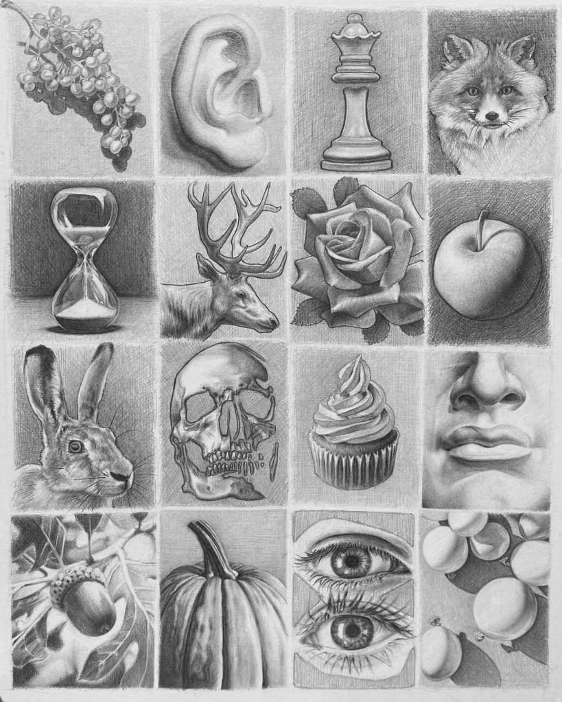 Still life graphite pencil drawing of a bear skull