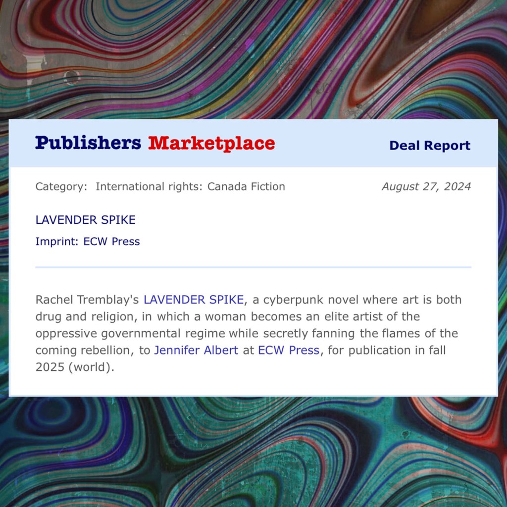 I am thrilled to announce that my dystopian, art-centric cyberpunk novel LAVENDER SPIKE will be published Spring 2026 with ECW Press!